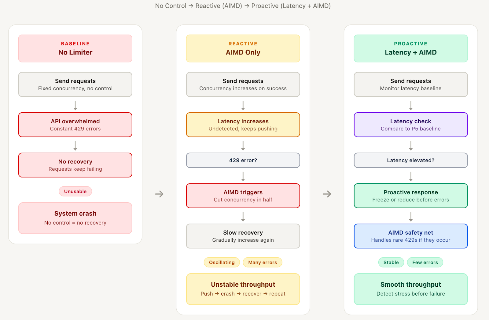 Drawing on research from Vegas-style algorithms and Netflix’s concurrency-limits library, we moved toward a hybrid control strategy. While pure latency-based limiting can be slow to ramp down or blind to failures, a hybrid approach uses latency for proactive management and AIMD as a reactive safety net. The proactive layer monitors response times against a baseline; when latency rises moderately, the system freezes the concurrency limit, and when it rises significantly, it reduces load preemptively before a failure occurs.